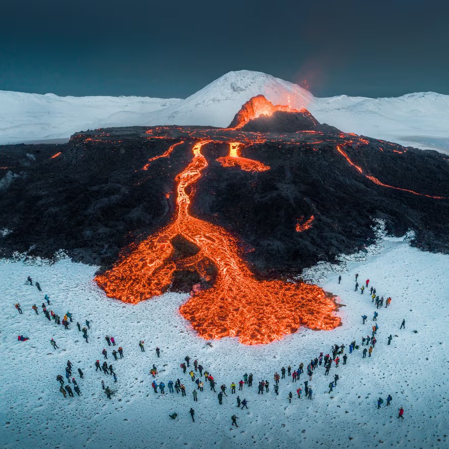 -- Tourists watch a volcano erupt, Iceland, Arnar Kristjansson, 9 April 2021
